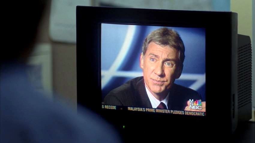 Diacovo (on the TV): "Of course, this campaign is still salvageable, but he certainly can't afford to make another Illinois-sized mistake, which is why I think some people have begun to question whether Josh Lyman is the right person to take the Santos campaign down the stretch."